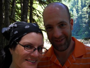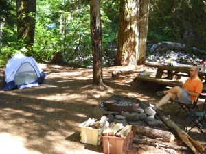 We continued up the Lewis River, and after driving around for a while we finally found our targeted campground, at Twin Falls. Someone had removed the sign from the main road, so it was difficult to find. I was worried that we wouldn’t get a site (there were only 5 or so), and since the campground was free, I was sure that we’d be out of luck in the middle of camping season. But it was no problem – we got a fantastic site right on the river. Our site was down an embankment so we didn’t hear noise from any of the other campers, who appeared to be a small group of under-aged kids celebrating a birthday (Tankimus Prime, apparently) the best way they knew how – by sitting in lawn chairs in the river, drinking vast quantities of beer, and smoking lots of pot out of a hookah pipe. They were friendly though, and the river was so loud we didn’t really hear much from them.