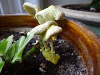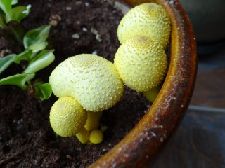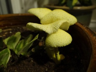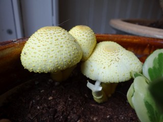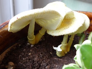 For those of you who do not have access to Facebook, here is a glimpse of some yellow parasol mushrooms (also known as flower pot parasols) growing in one of our indoor pots. They are common inside when it’s humid out, and they are poisonous if eaten. As much as I hate mushrooms, these were really interesting to watch – you could see growth by the hour. They grew to about 4 inches in height. The entire phase happened over the course of about three days!