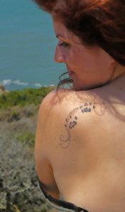 I had enough foresight to get a couple of paw prints from Zoe before she died. I had them tattooed on my shoulder along with a little grey swirl behind – it’s a bit hard to see in these pictures, but I’m happy with it overall. Zoe and I went through a lot together and she supported me during some tough times…now I’ll always have her little paws on my shoulder no matter what.
